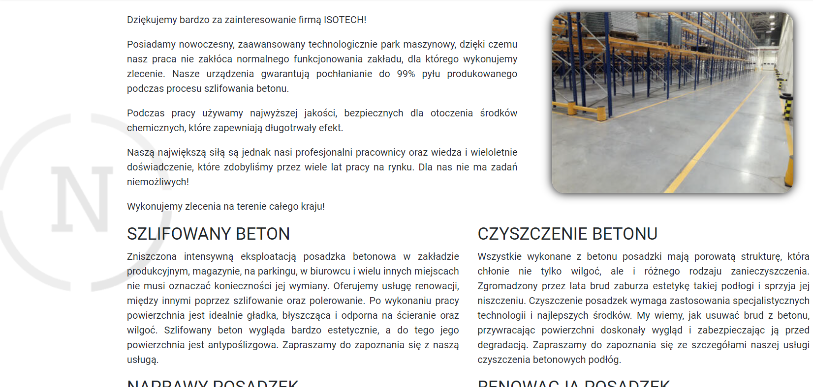 ISOTECH to firma, która o posadzkach betonowych wie wszystko. Zajmują się m.in. renowacją posadzek, szlifowaniem betonu, konserwacją podług betonowych czy malowaniem nowych oznaczeń na posadzkach. Podczas wykonywania zlecenia wszystko przebiega maksymalnie bezpiecznie i z zachowaniem wszystkich norm, dzięki czemu jakość wykonanej usługi jest na najwyższym możliwym poziomie, a profesjonaliści posiadają wieloletnie doświadczenie i ogrom wiedzy na temat wykonywanej pracy. Więcej na temat oferty ISOTECH oraz ich realizacji dowiesz się odwiedzając stronę internetową, jaką dla nich przygotowaliśmy.