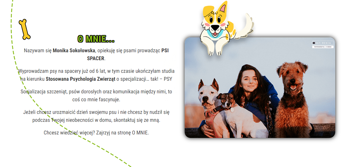 Monika Sokołowska, dla której stworzyliśmy stronę internetową psispacer.pl wie o psach i ich zachowaniu niemal wszystko. Jest autorką pracy licencjackiej na temat socjalizacji szczeniąt i absolwentką studiów Stosowanej Psychologii Zwierząt o specjalizacji Psy. Stworzenie zespołu Psiego Spaceru było jej marzeniem i właśnie w ten sposób powstała strona internetowa, za pośrednictwem której umówisz swojego psa na wyprowadzenie na spacer, a po wszystkim zostanie on bezpiecznie oddany z powrotem w Twoje ręce. To świetne rozwiązanie zwłaszcza gdy brakuje Ci wolnego czasu, a jednocześnie zależy na szczęściu Twojego pupila.