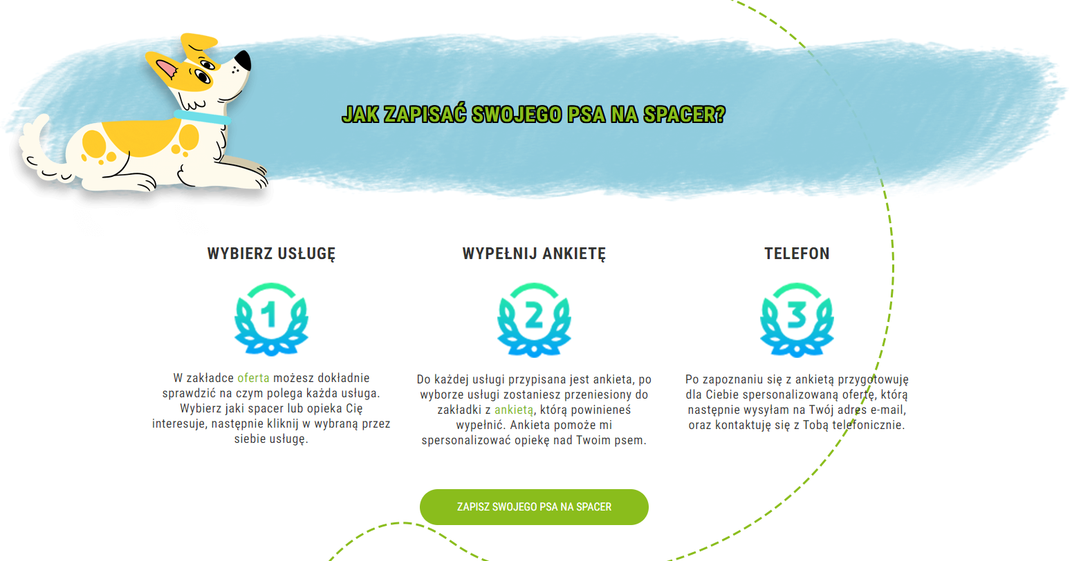 W trzyetapowym zapisie, który stworzyliśmy, najpierw trzeba wybrać usługę, a następnie wypełnić ankietę, dzięki której łatwo będzie można spersonalizować rodzaj opieki nad pupilem. Na końcu otrzymujesz maila oraz telefon ze spersonalizowaną ofertą dla Twojego pieska. Dzięki tym trzem prostym krokom zorganizujesz czas swojemu pupilowi, bez komplikacji i kombinatoryki.