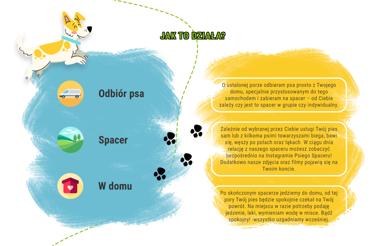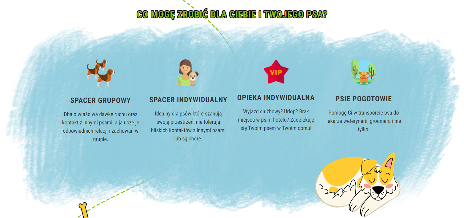 Projekt graficzny przedstawia zadowolonego czworonoga wręcz w bajkowym klimacie. Cała strona utrzymuje taki styl. Portal został stworzony bardzo prosto, co pozwala na bezproblemowe przemieszczanie się między zakładkami. W projektowanie strony włożyliśmy całe nasze serce, aby przynosiła zyski naszej klientce, a pupile zapracowanych właścicieli mogły spędzić wesoło czas.